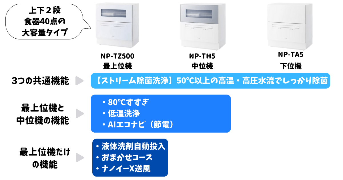 | 項目 | ![]() ![]() NP-TZ500 最上位機 | ![]() ![]() \おすすめ/ NP-TH5 中位機 | ![]() ![]() NP-TA5 下位機 |
