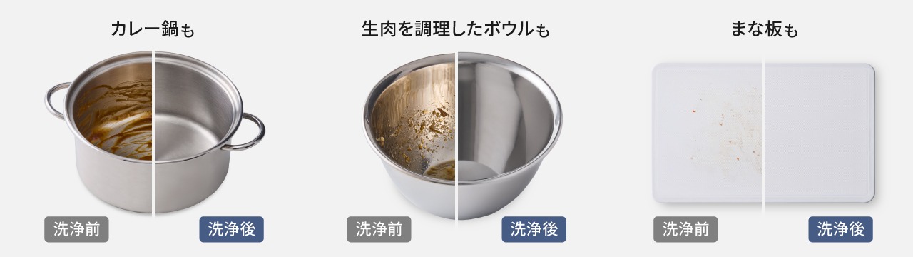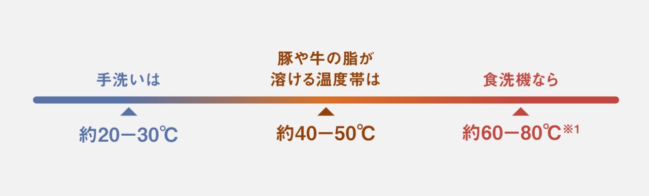 専用洗剤と約80℃の高温すすぎで、カレーのこびりつきや油汚れもスッキリ!