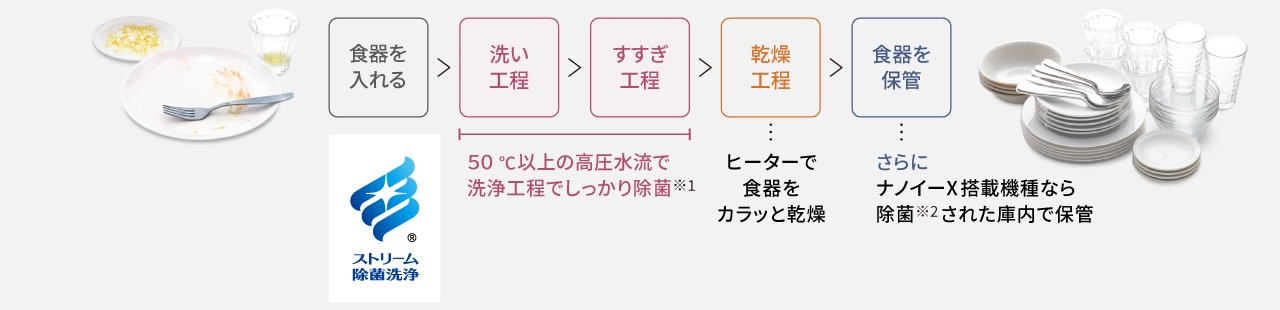 洗い・すすぎ時に50℃以上の高温水と高圧水流で、脂汚れを落としながらしっかり除菌してくれます。